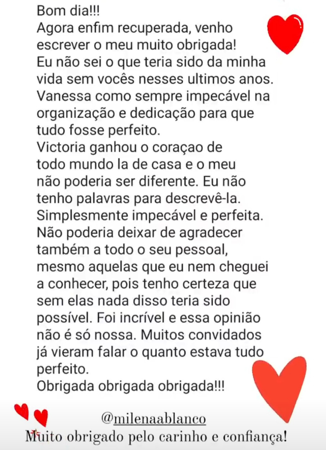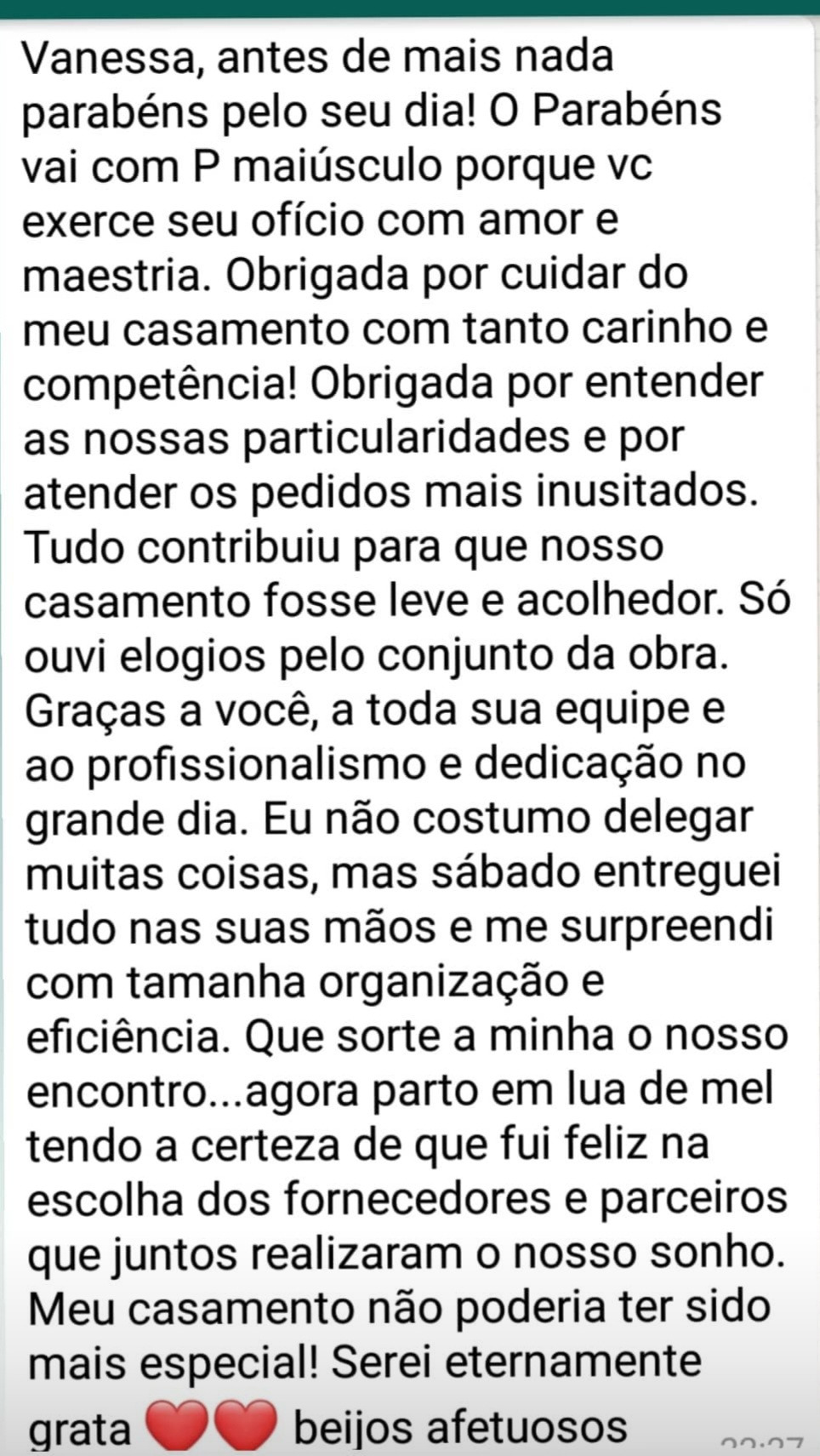 "Vanessa você entregou uma festa irretocável, nas palavras dos meu convidados"